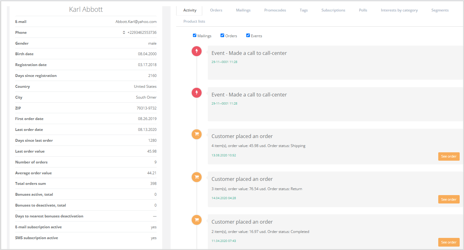 - history of mailings related to the customer, assignment of metrics, accrual of bonus points;