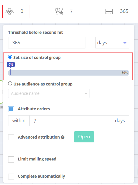 - By percentage — ranging from 0% to 50% of the target segment (default is 0%). The number of customers included in the control group is displayed.