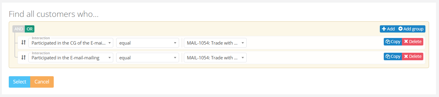 To select the entire mailing/campaign segment (CG + main group), apply two filters combined with the logical operator OR. Example:
