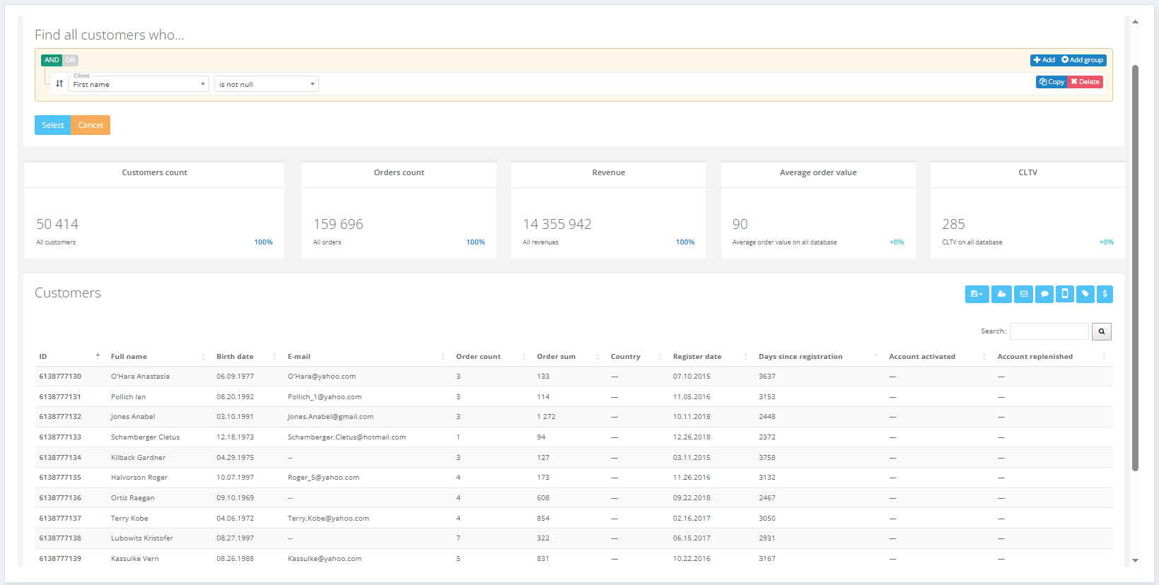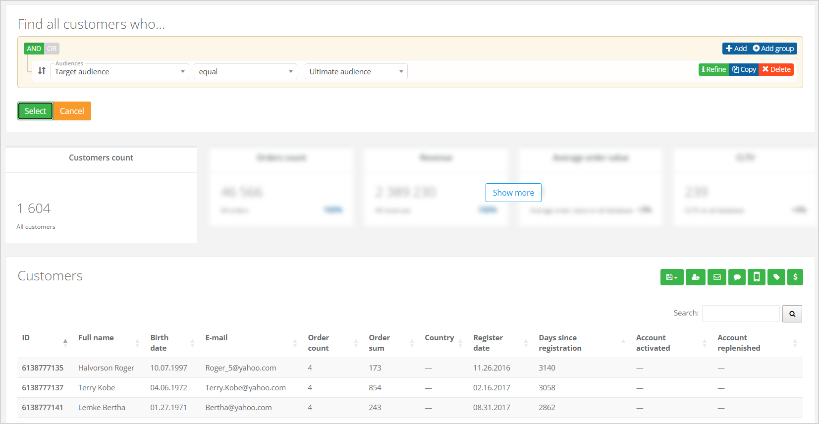 Actions that can be quickly performed with a selected customer segment by clicking a button are described in detail in the article Segment builder. Segment metrics such as number of orders, revenue, average receipt amount, etc., are also covered there.