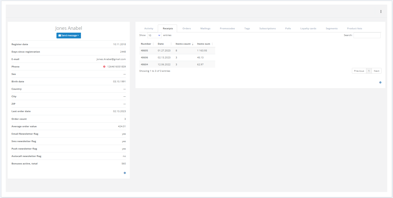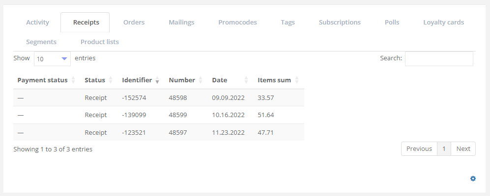 You can view information about all receipts issued to the customer in the Receipts (Cheques) tab. For each receipt, the following details are available: