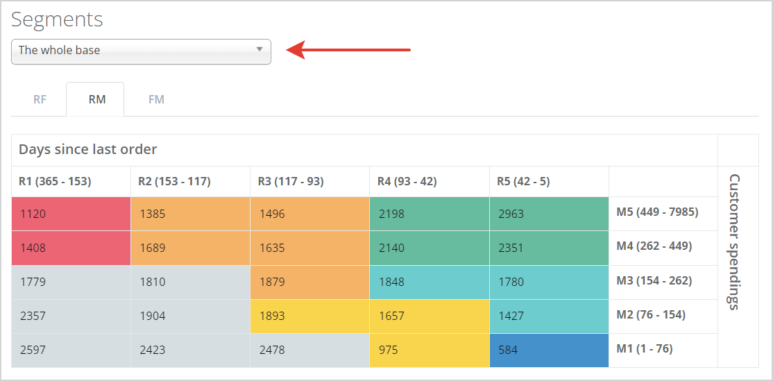 A cell in this table corresponds to one segment. For example, segment R5-M5 includes customers who made purchases for the sums from 449 to 7,985 USD, and the last purchase was made from 5 to 42 days ago.