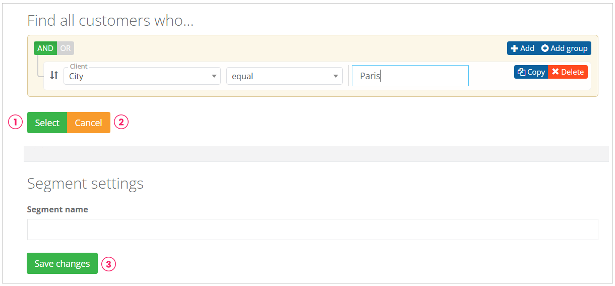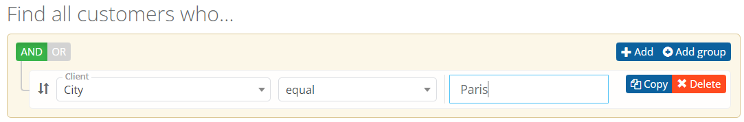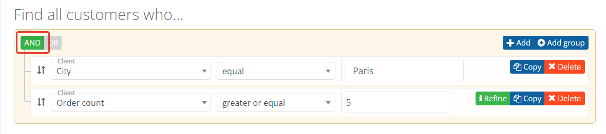 For example, you need to create a segment: "All customers who live in Paris, who have made at least 5 orders.” Two conditions must be met simultaneously, so you have to use AND. |