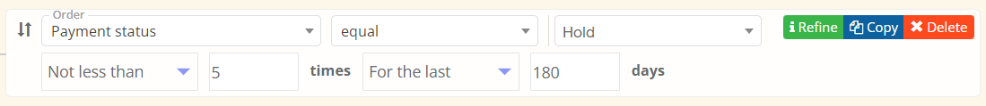 For example, the payment had the status "Hold" at least 5 times in the last 180 days: |