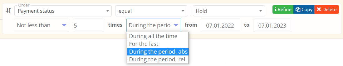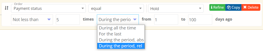 | | The payment had the status "Hold" at least 5 times between 1 and 100 days ago: |