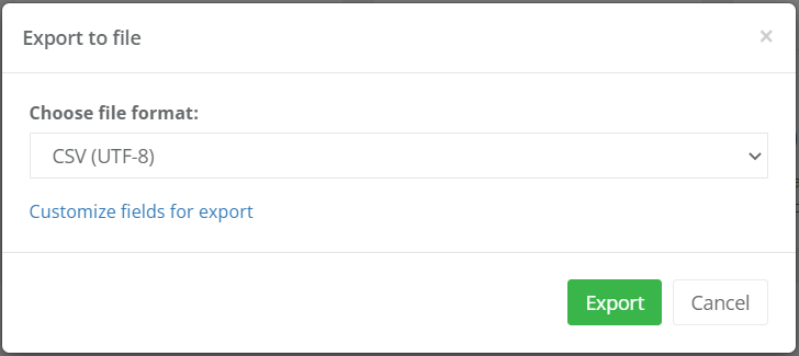 To download a customer segment to CSV, you must select the text encoding: - Choose file format: UTF-8, Windows, XLS, .XLSX, .ODS, HTML.