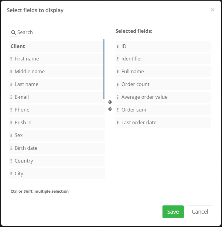 Select the fields for export. To add a field to the CSV file, you must drag and drop it from the left column to the right column. Field search by name is available. The order of the fields in the CSV file can be changed by dragging and dropping them.