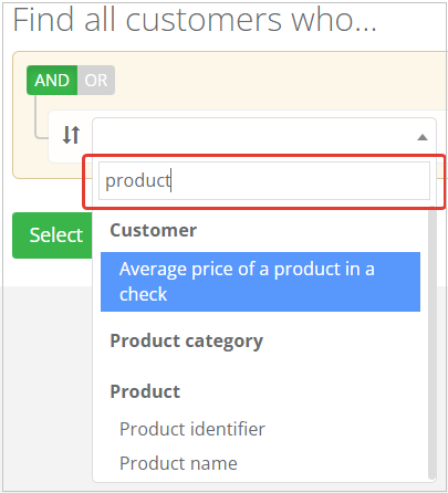 To select the attribute you want, start typing its name in the search box. For example, type "product". Only attributes that contain the entered text will remain in the list:* in the name: "Average price of a product in a check", "Product identifier"; or in the name of the group: group "Product", attributes "Product identifiers", "Product name", etc.