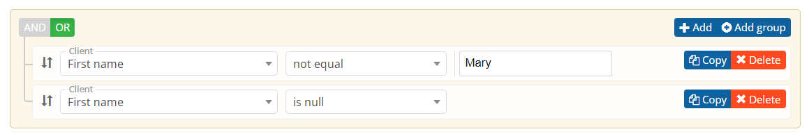For example, you want to see a list of all customers whose name is not Mary or whose name is unknown. The condition will look like this: