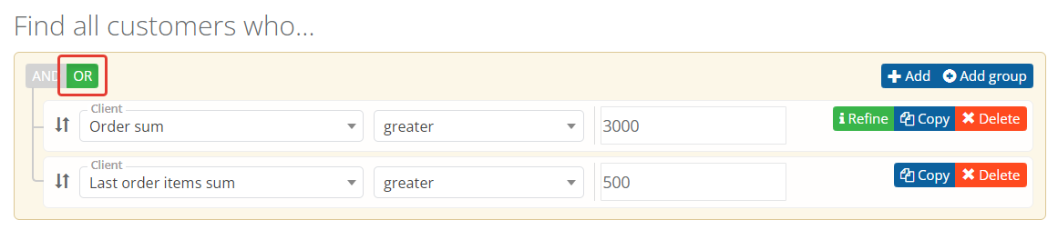 Let’s look at another segment: "All customers whose orders total is more than 3,000, or whose last order was more than 500." At least one of the conditions must be met, so you must put an OR between them. |