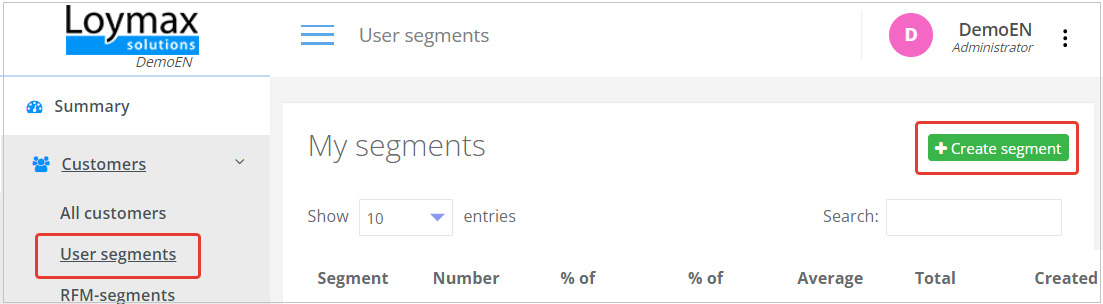 To create a new segment, in the main menu select section Customers -> User segments. Click Create segment button.