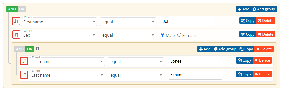 | The conditions in the segment builder can be swapped. To do this, left-click the icon highlighted in red on the picture below and drag the condition to the desired location. |