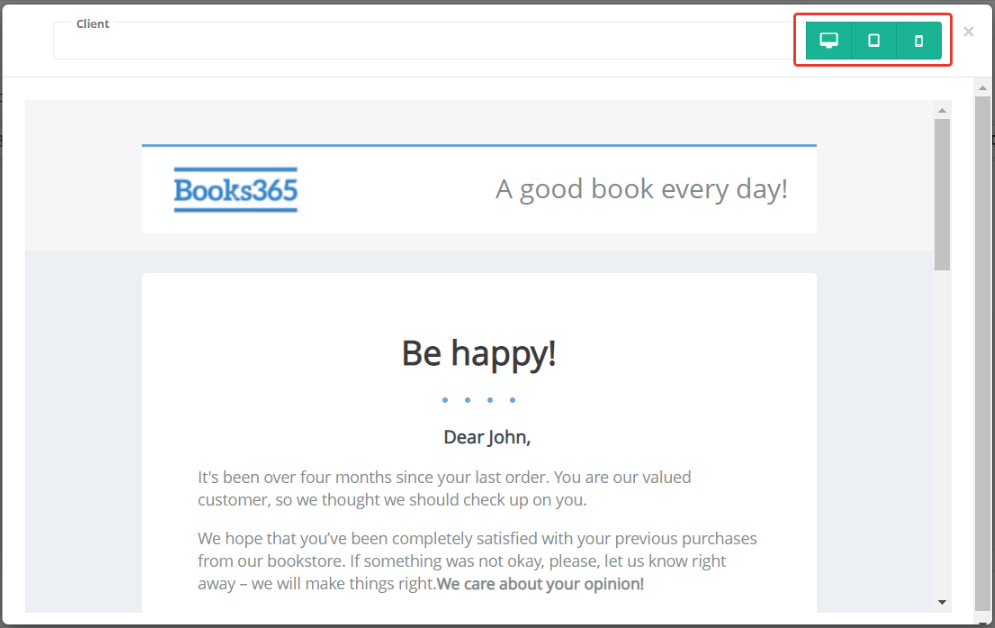 13. Preview the message. Use the icons in the top-right corner to preview how the email will appear on desktop, tablet, or mobile devices.