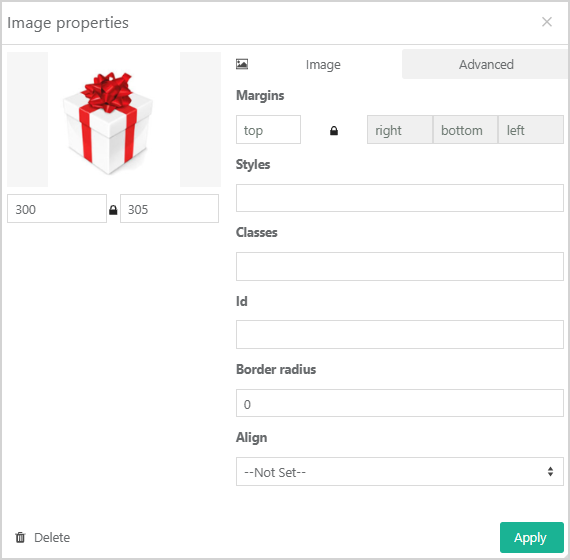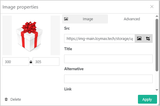 Clicking the edit button opens the Image properties modal window that displays the selected image. You can specify or modify the image dimensions by clicking the lock icon below the image and entering the desired values.