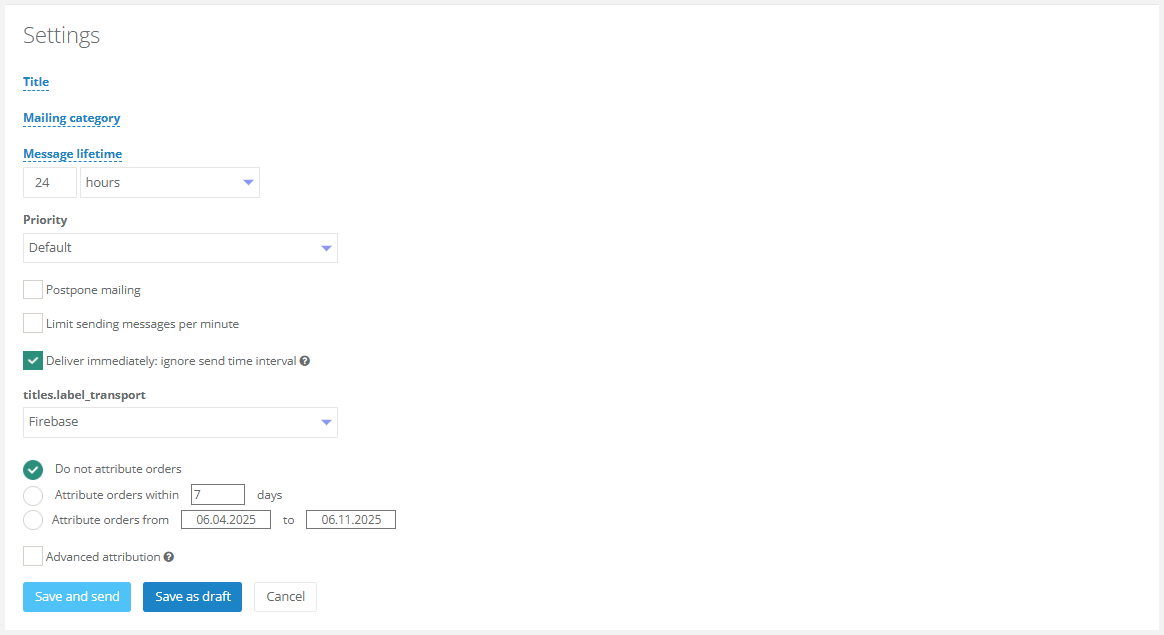 All types of settings have the same set of settings. Detailed description of mailing settings can be found in a separate article.