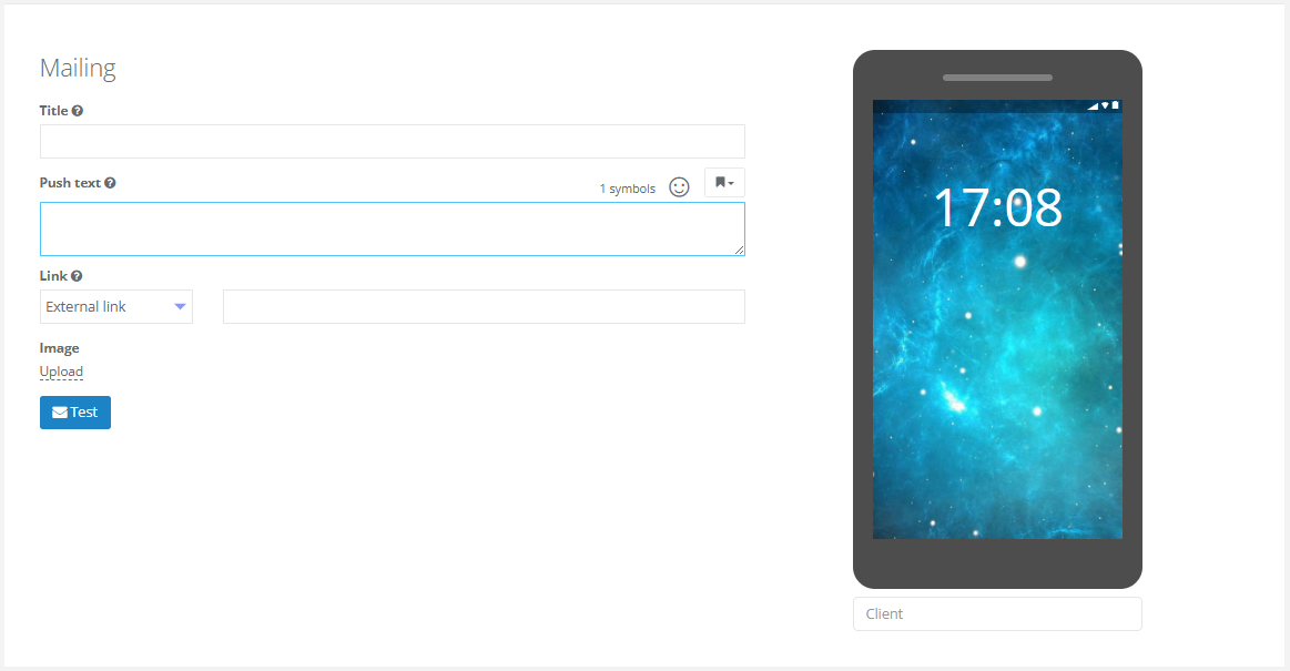 After filling out the message parameters, you can send a test message. To do this, click Test. In the opened window specify the Push-ID and click Send.