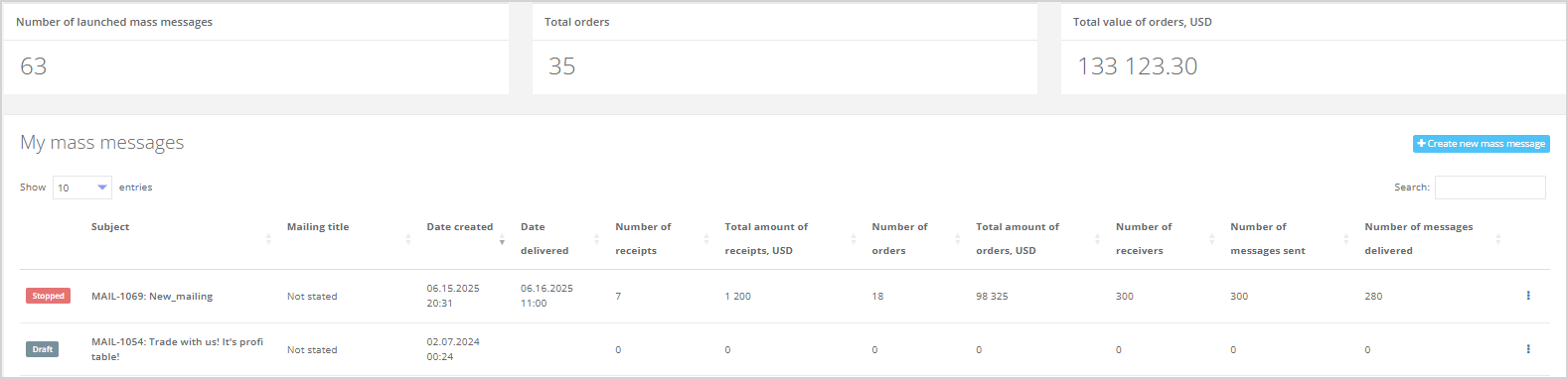 • Consider an order/receipt as linked to a communication if the customer received a message (in case of an email/push mailing — if they opened a message; in case of SMS mailing — if the message was delivered) and made a purchase within 10 days;