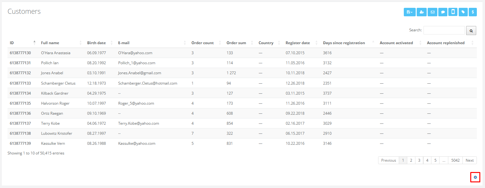 To change the set of visible fields, click the gear icon in the bottom-right corner of the screen.