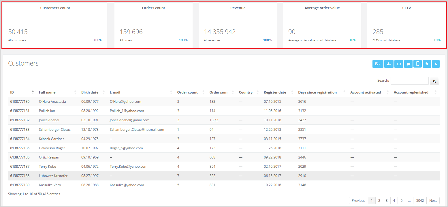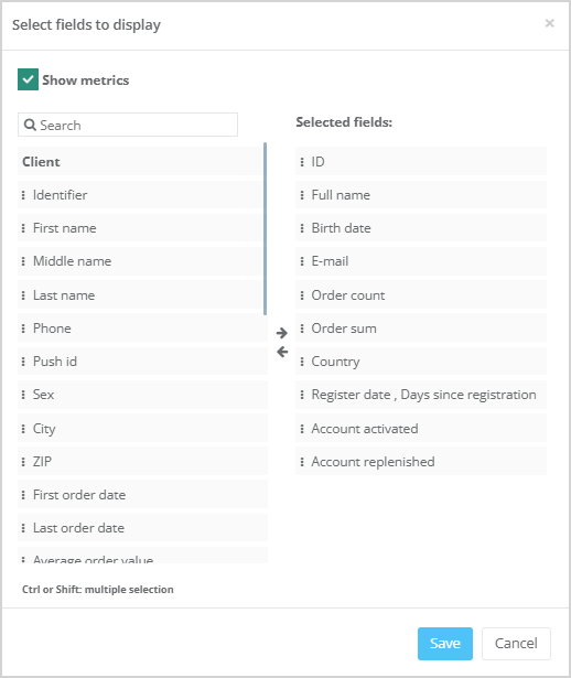 For the customer list, there is also an option called Show metrics. If the checkbox is enabled, metrics will be displayed above the customer list.