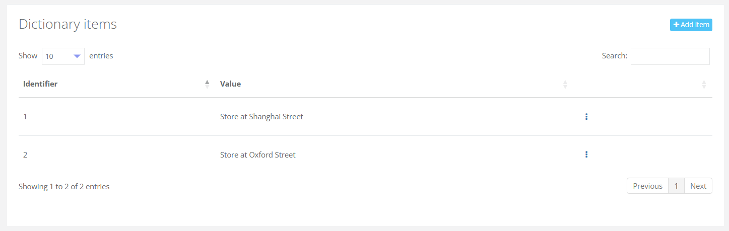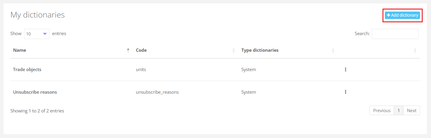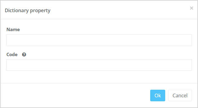 To create a new dictionary, click the Add dictionary button. The Dictionary properties window will open. You need to specify the Name and Code of the dictionary. The code is used to access the dictionary via API.