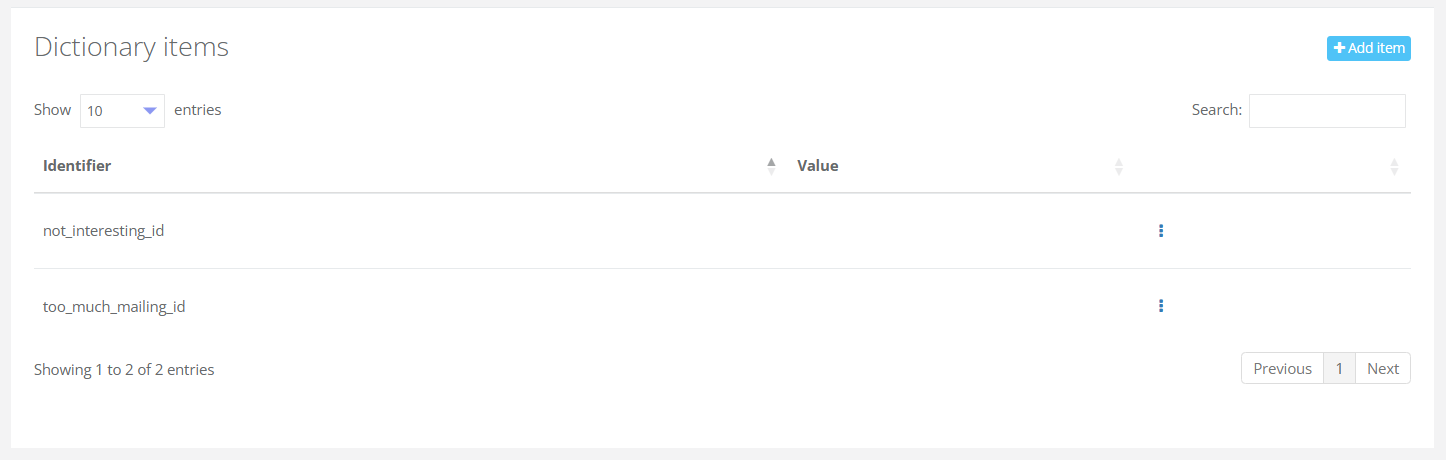 Click on the Unsubscribe Reasons dictionary name to open the Dictionary items page. By default, two unsubscribe reasons are already set up: