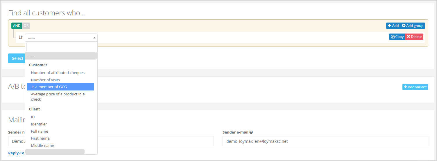Global control group is defined as a percentage of the total customer base for a specified period. The system allows to include or exclude GCG members in all ongoing campaigns and mailings. The customers will not receive the mailing, even if they are included in the segment if Exclude GCG members is selected within a communication.