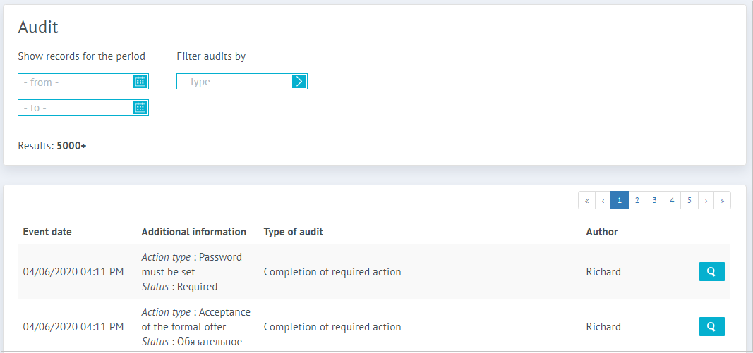 Using the section filters, it is possible to search by the Date of action, Card number and Audit type. With these parameters are set, a list of actions which meet the parameters are generated.