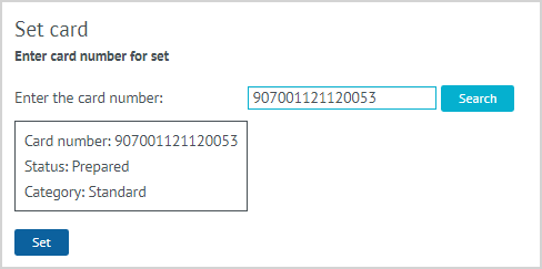 | 1. To link a physical bonus card to the LP Member's profile, the CC Agent selects the Set card action. 2. In the field that appears, the CC Agent enters the number of the card that needs to be linked to the Member's profile and clicks on the Search button. 3. The information on the linked card appears. The CC agent clicks Set. |