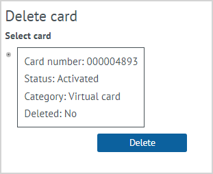 To remove a card, select the Delete card action on the customer’s card. The form displays the customer’s cards with the number, status and category. It is need to put a mark for the card should be removed, and click Delete. The selected card will be removed from the list of customer cards. If the customer has only one card, it cannot be deleted. |