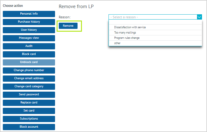 | 1. The member calls the Call Center and reports his desire to be removed from the Loyalty Program. 2. The Agent clicks on the Remove from LP button in the LP Member data sheet. 3. The Agent opens the drop-down list Select a reason and selects one of the reasons presented in it from the Member's words to remove from the Loyalty Program: - Dissatisfaction with service