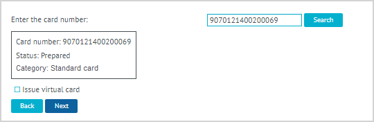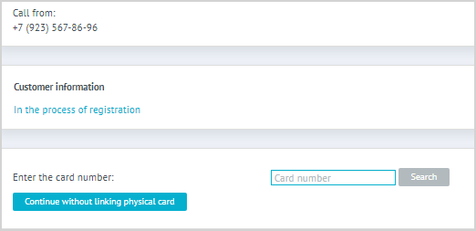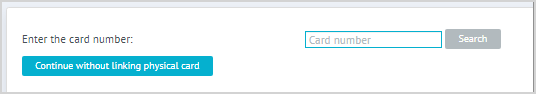 | 1. Searching and linking physical card. Issuing a virtual cardPhysical card searchingIf registration is performed by physical card number then clicking Register summons a field for entering the card number. Enter the number in this field and click Search. |