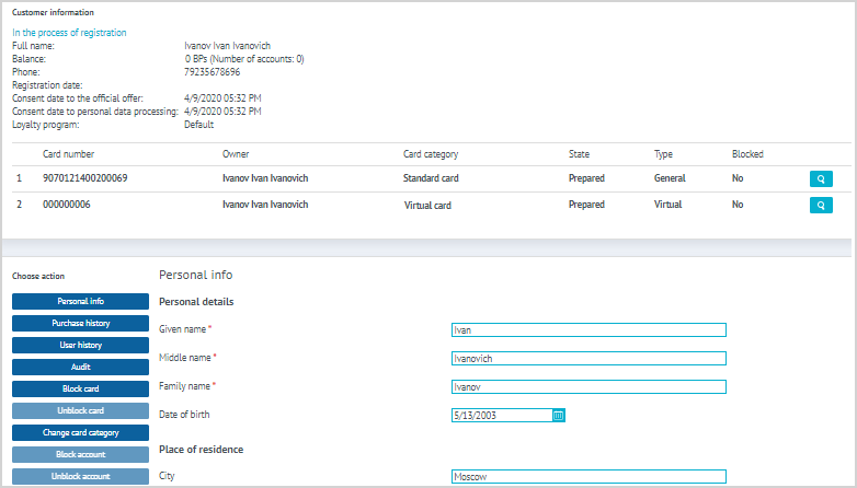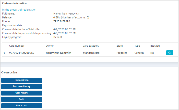 | If the card is found not linked to another LP Member, a window containing information on this card appears on the form. In this case the Call Center agent is able to continue registration of the customer. |