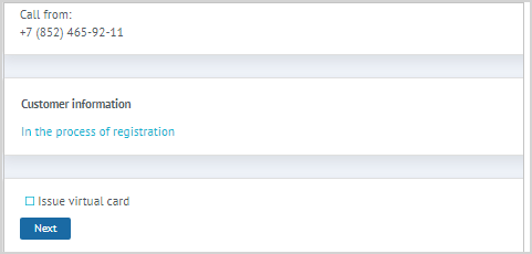 | Virtual card issuingAt the step of linking a physical card it is possible to issue a virtual card with the correct system configuration settings settings. The Call Center agent should ask the customer whether they need a virtual card. if the answer is yes, the agent needs to check the Issue virtual card flag. In addition to the physical, a virtual card will also be linked to the profile of the new LP Member. Click Next to continue registration. |
