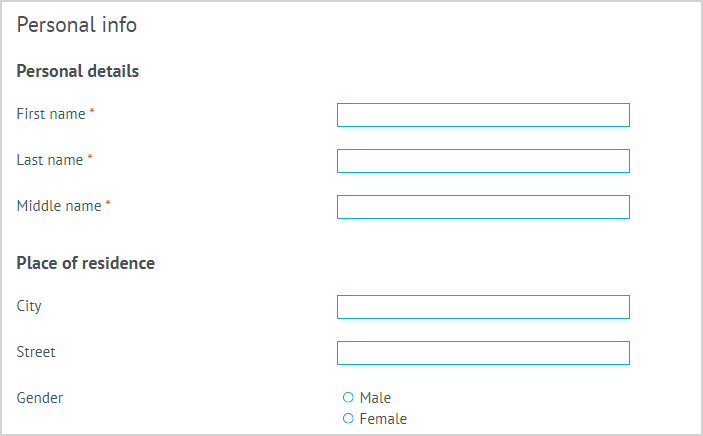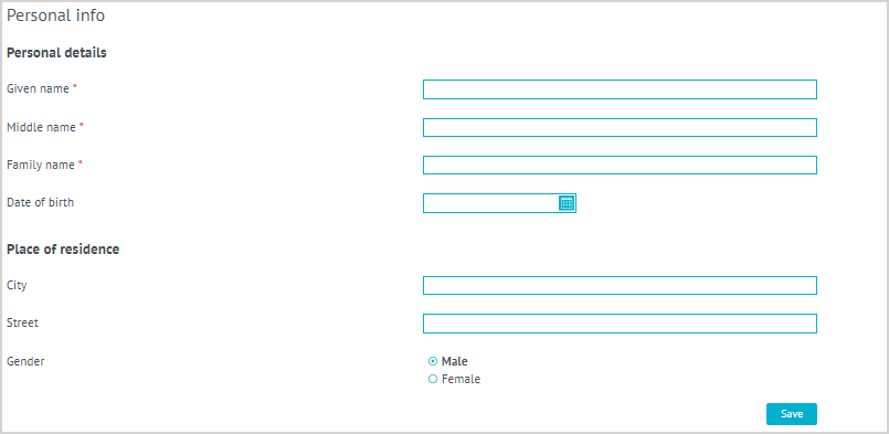 | To complete the registration, fill in the required fields under Personal Info and click Save. The list of required fields may vary depending on the configuration of the application form. |