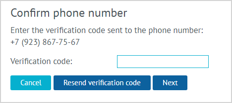 | 2. Phone number confirmationTo confirm the phone number, the customer needs to provide the verification code sent to the specified number, enter it in a special field, and click Next. The verification code can also be found in Loymax Platform section under Mailing History - SMS messages. To register a customer without confirming the phone number, the Call Center agent needs the appropriate permission. Read more in the Call Center Settings in Loymax Platform article. |